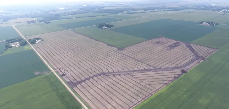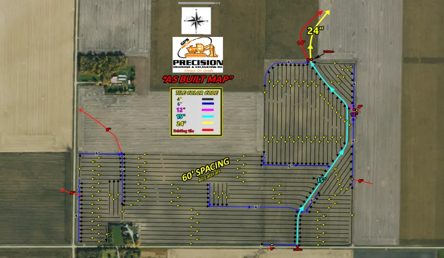 My father, Bill Manske, Sr., taught me that the most important thing to do is document all drainage work. These records are critical and add tremendous value to the farmer and landowner once the project is completed. At Precision Drainage and Excavating, we take pride in providing you with a detailed high-quality tile map. Below is an example of a completed tile map, as well as an aerial photo of the farm that was tiled.