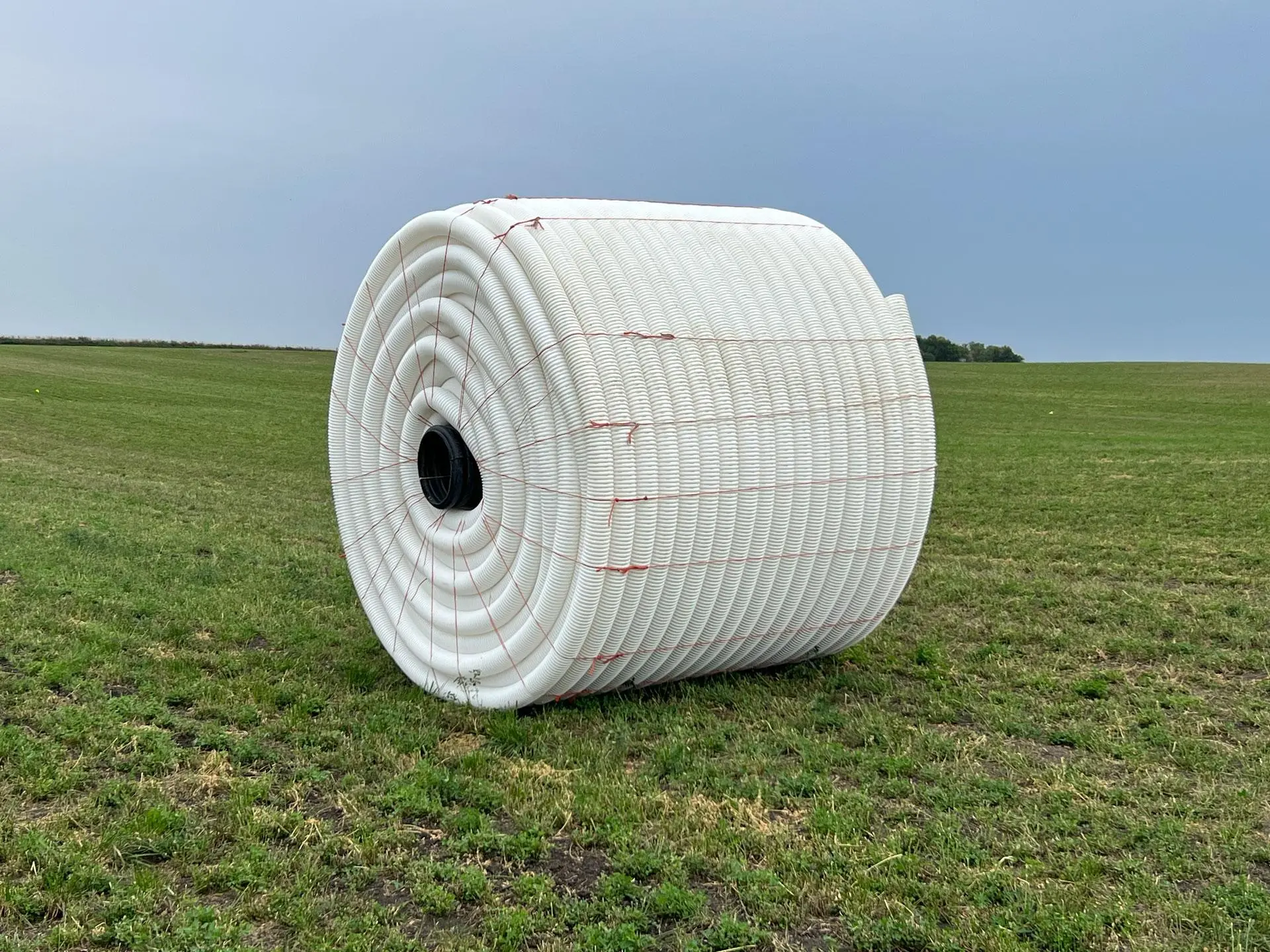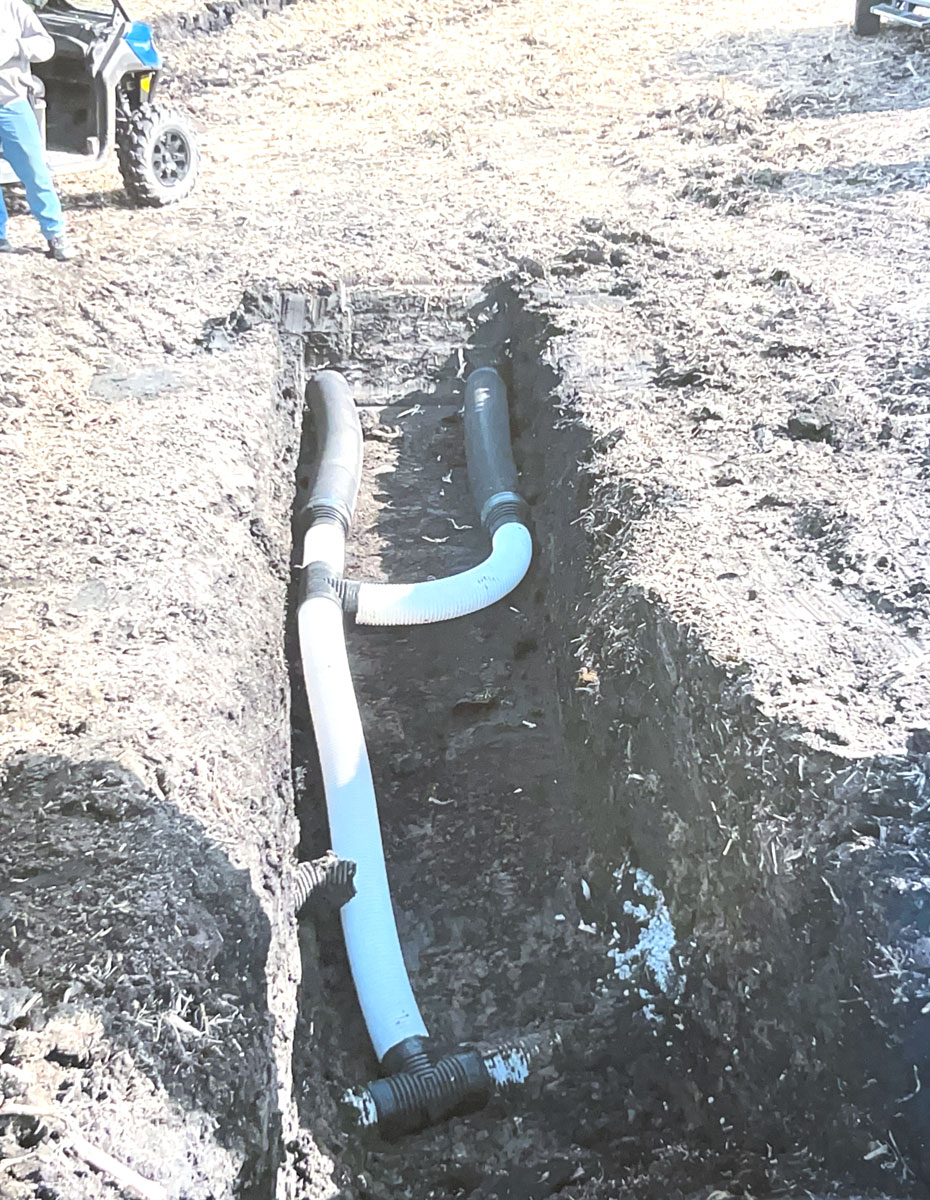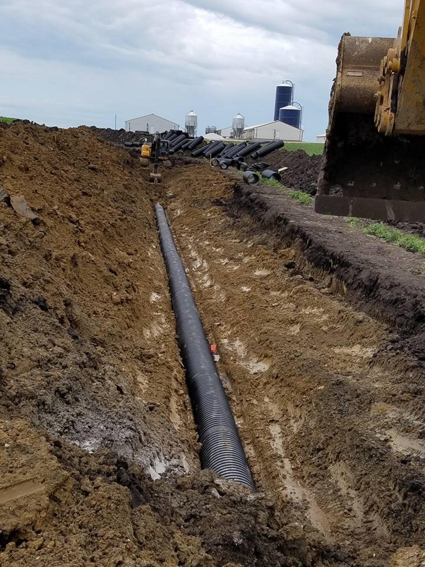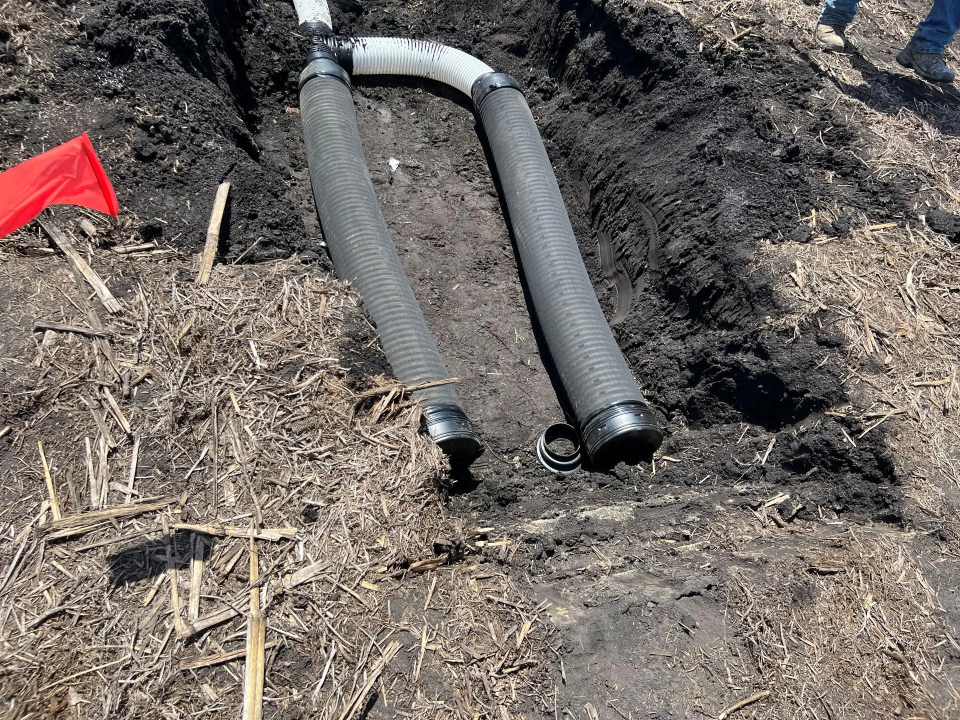 It takes two 8-inch muck tile with silt wraps. These work great for getting rid of surface water quickly. Many times with traditional intakes farming around them can be inconvenient. Our rock intakes make it much easier to plant and harvest around while maintaining the integrity of the intake.