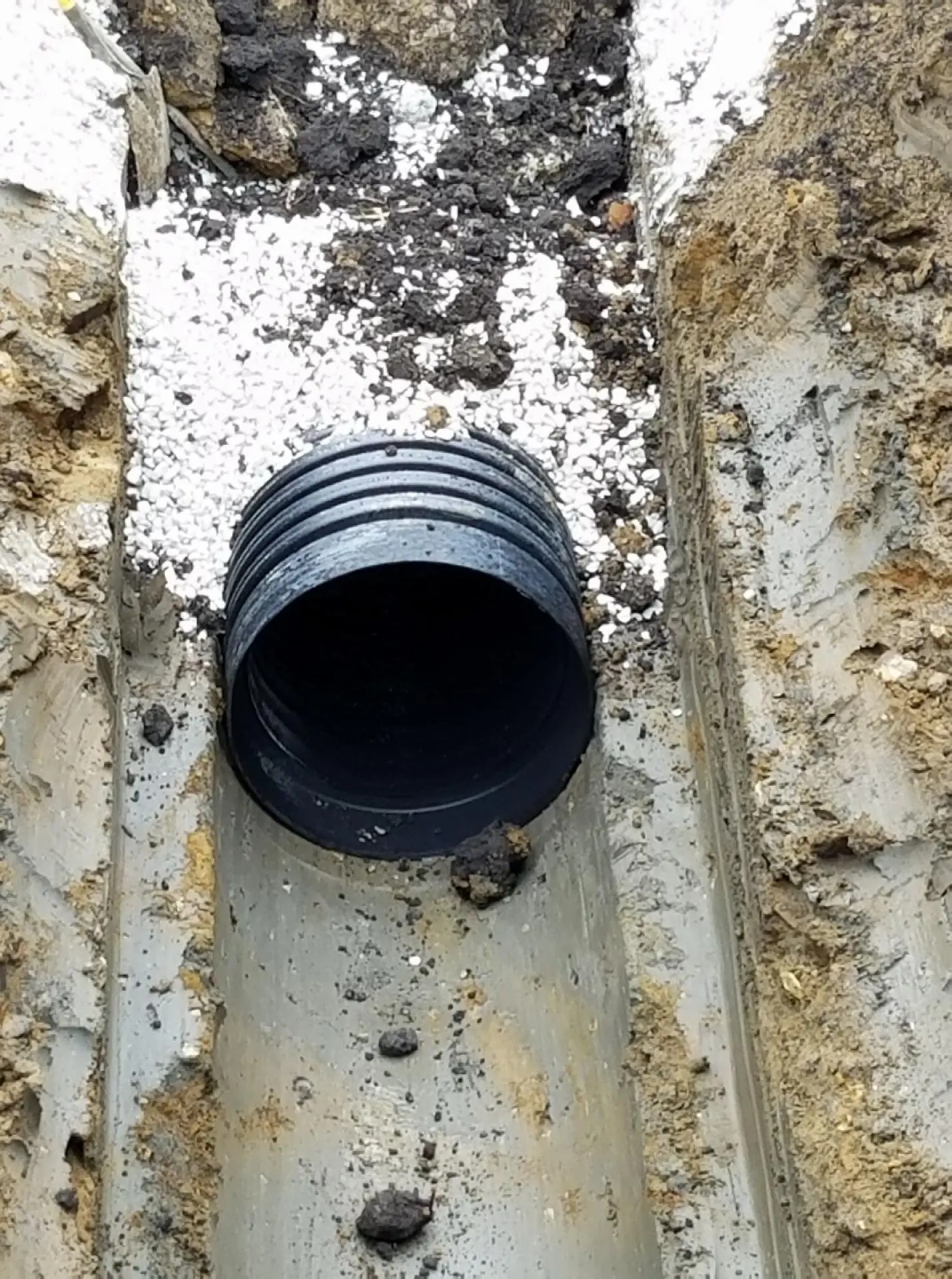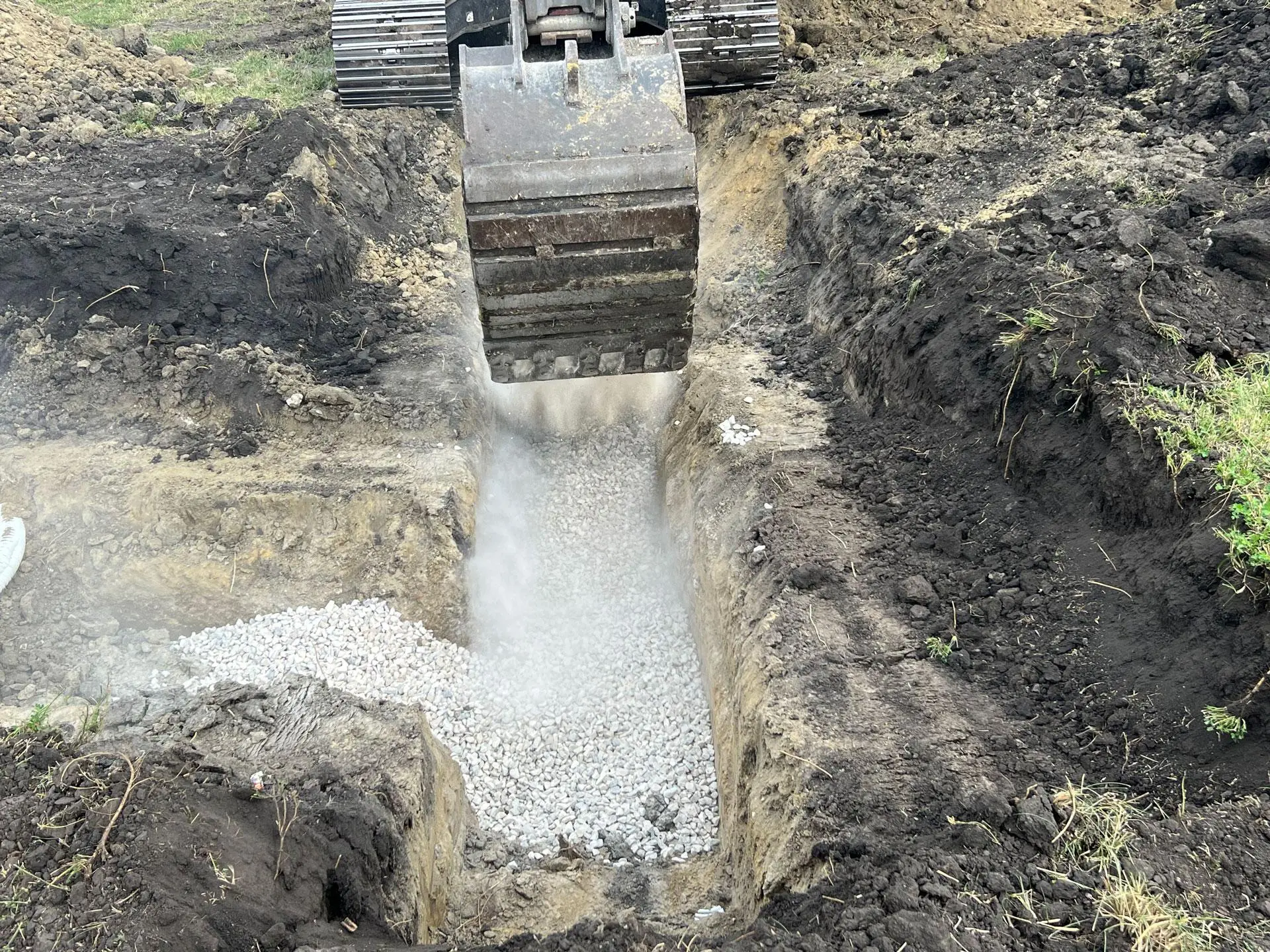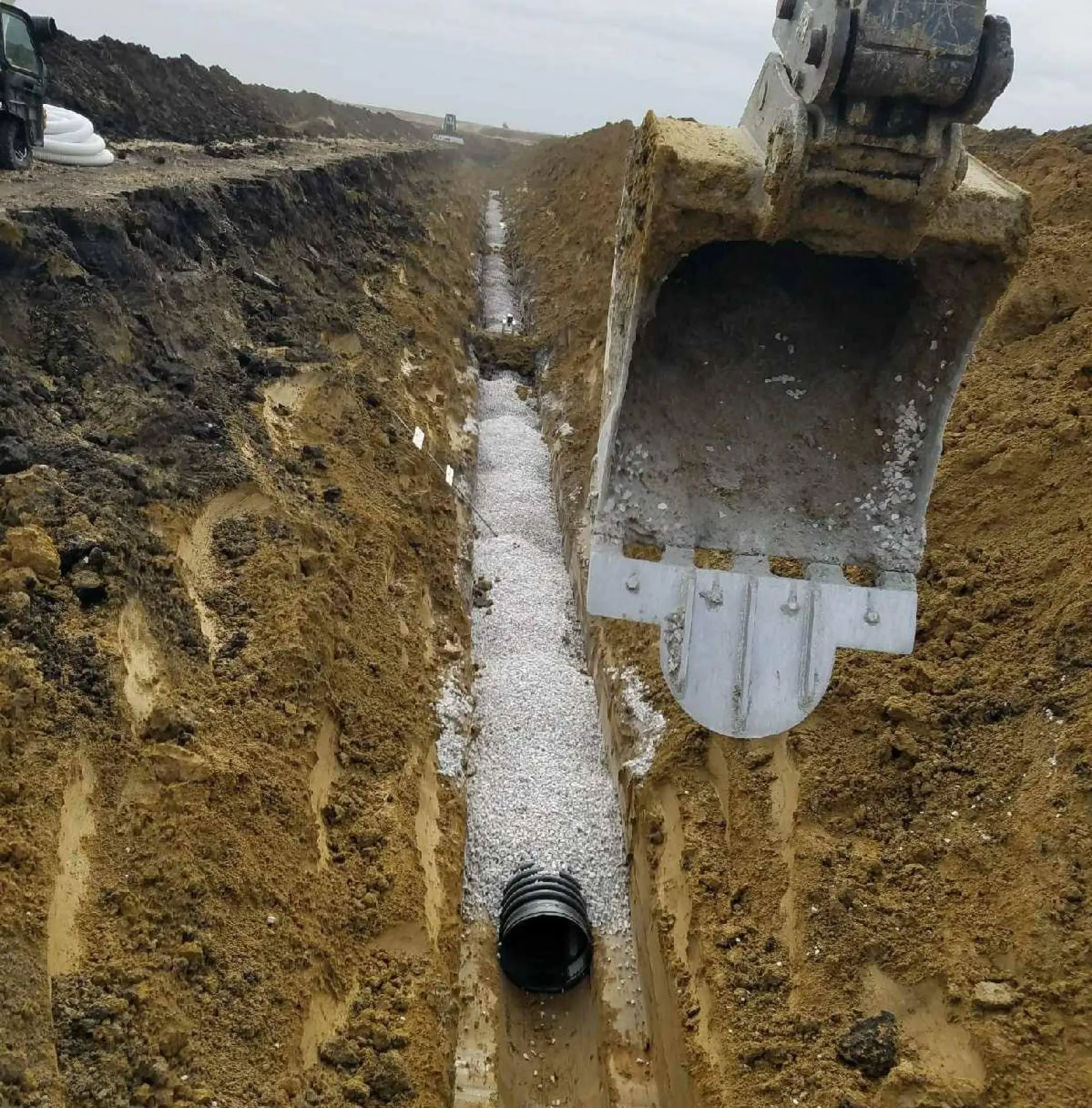 Photo This is a close-up example of the support the spoon on our excavator provides. Also, note the rock we use to provide an extra level of support to ensure the integrity of the pipe.
